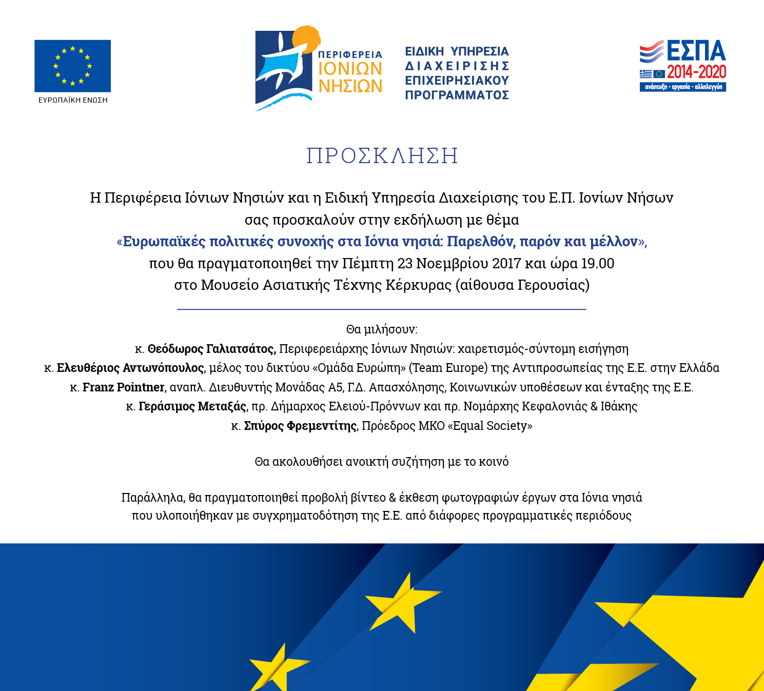 Εκδήλωση με θέμα “Οι ευρωπαικές πολιτικές συνοχής στα Ιόνια νησιά: Παρελθόν, παρον και μέλλον”, Κέρκυρα, 23/11/2017