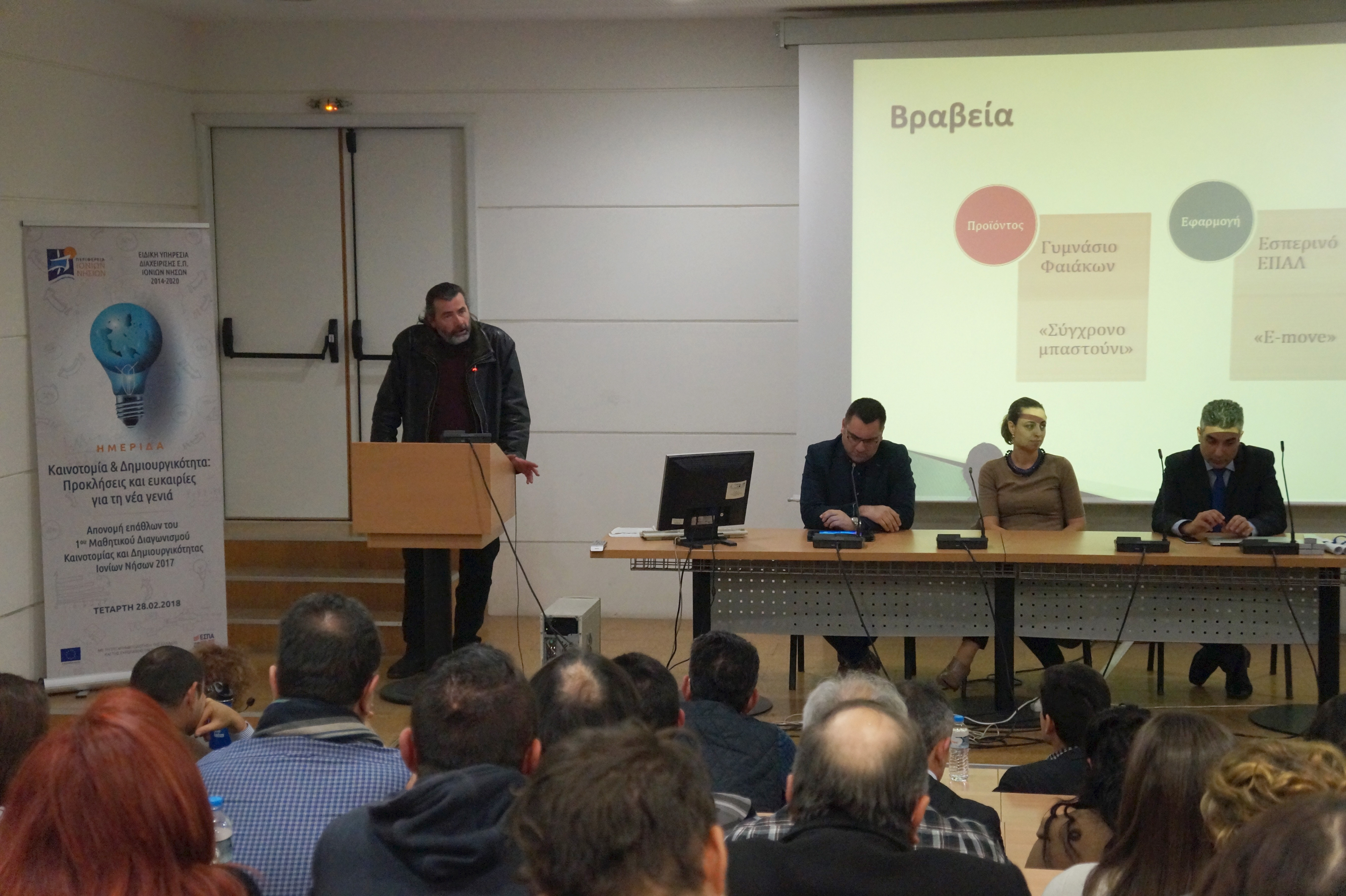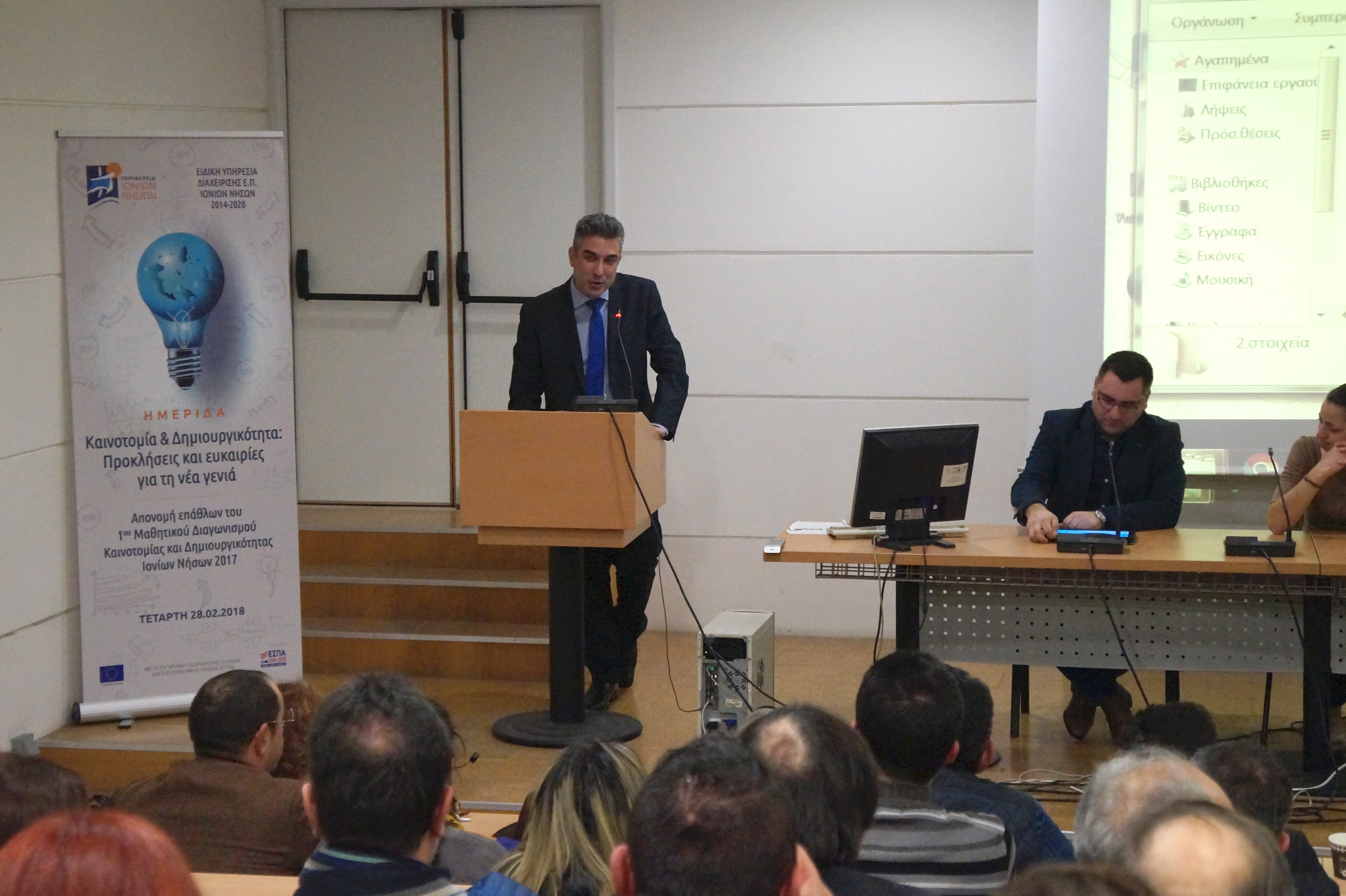 Τα έπαθλα στις νικήτριες ομάδες του 1ου Μαθητικού Διαγωνισμού Καινοτομίας και Δημιουργικότητας Ιονίων Νήσων, απένειμε το βράδυ της Τετάρτης 28/2/2018, ο Περιφερειάρχης Ιονίων νήσων Θεόδωρος Γαλιατσάτος, στο πλαίσιο της ημερίδας που διοργάνωσε η Ειδική Υπηρεσία Διαχείρισης του Ε.Π. Ιονίων με θέμα «Καινοτομία και Δημιουργικότητα: Προκλήσεις και ευκαιρίες για τη νέα γενιά».